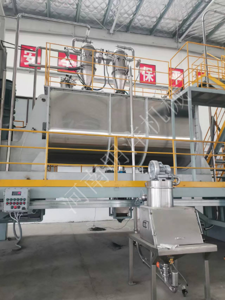 噸包無塵投料站,真空上料機(jī)氣力輸送,臥式螺帶混合機(jī),真空上料機(jī)輸送,緩存?zhèn)},篩分除磁包裝生產(chǎn)線。