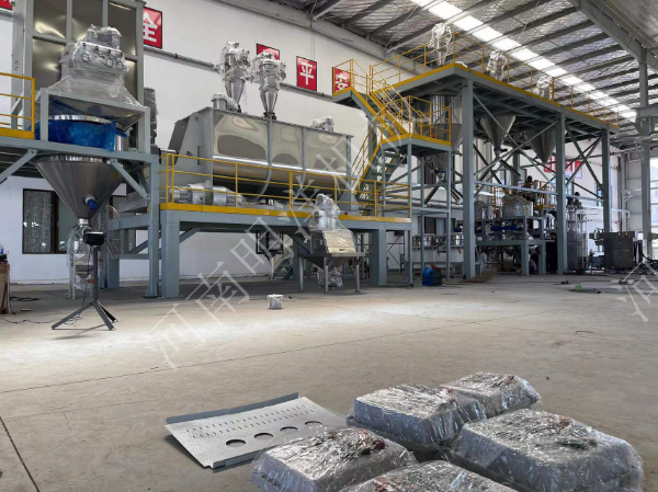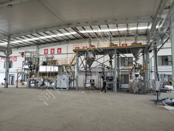噸包無塵投料站,真空上料機(jī)氣力輸送,臥式螺帶混合機(jī),真空上料機(jī)輸送,緩存?zhèn)},篩分除磁包裝生產(chǎn)線。